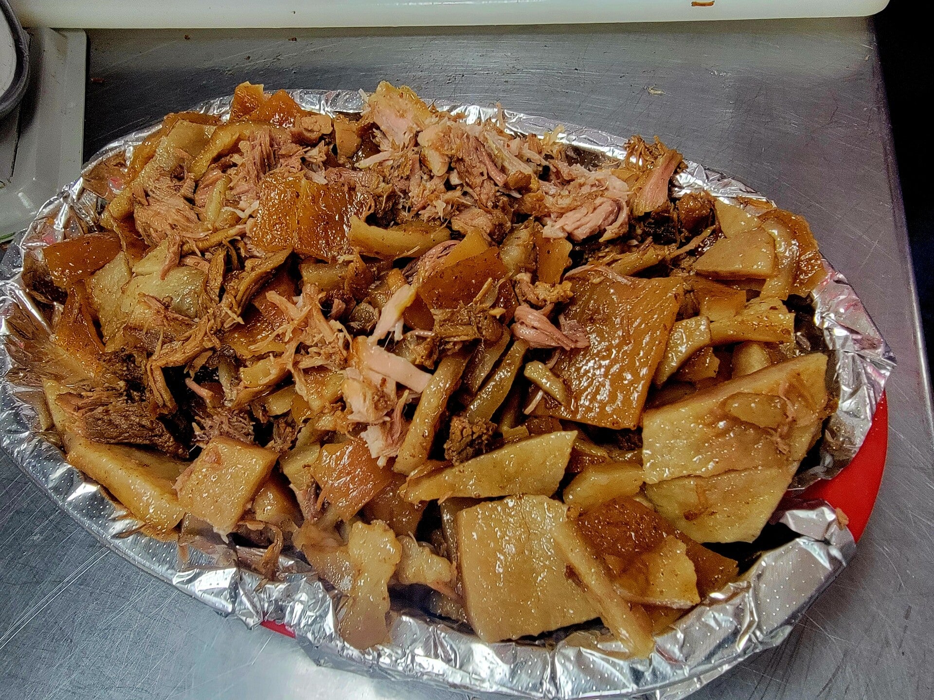 Una mezcla de carne asada, pastor, tocino, chile morrón verde, amarillo y rojo a la plancha; cebollitas fritas, cubierrtas con queso derretido.